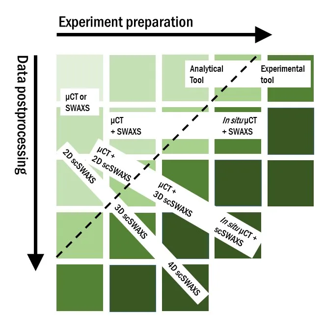 Some of the experimental modalities at ForMAX require significant effort and expertise from the users, both in terms of experiment preparation and data processing. This is illustrated in the figure below, where the dashed line approximately differentiates between ‘analytical’ modalities that are suitable for general users from experimental modalities that require a high level of technical maturity among the users. It is advisable to secure suitable expertise within the team already prior to proposal submission.
