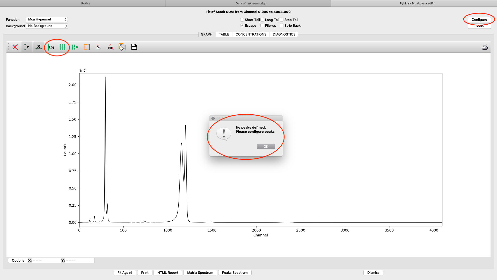 A new window with the sum spectrum opens. A dialog box says No peaks defined. Close it and select configure.